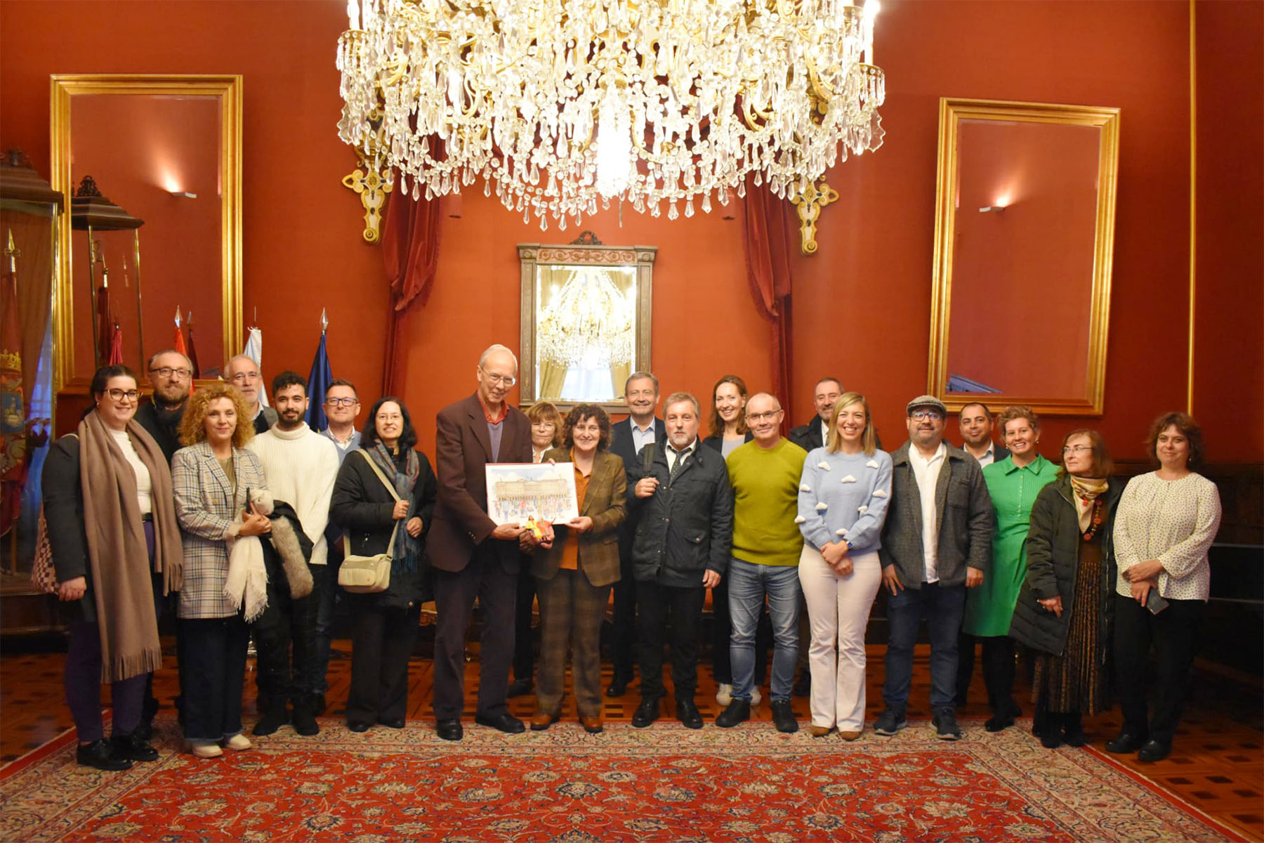 Die Vertreterinnen und Vertreter der Europäischen Presse Clubs beim Empfang im Rathaus von Santiago de Compostela als Gäste von Bürgermeisterin Goretti Sanmartin Rei (Mitte) im November 2023.