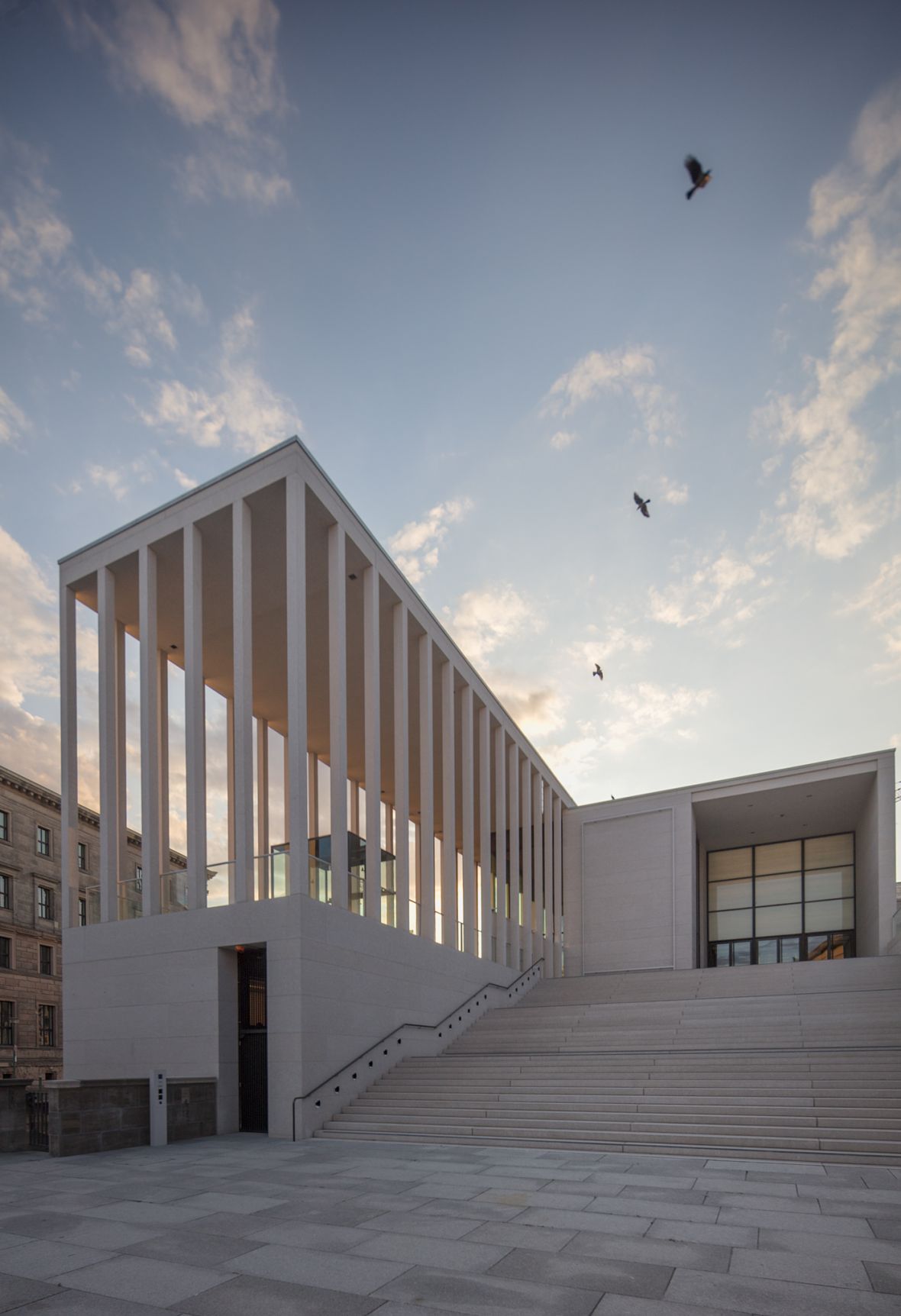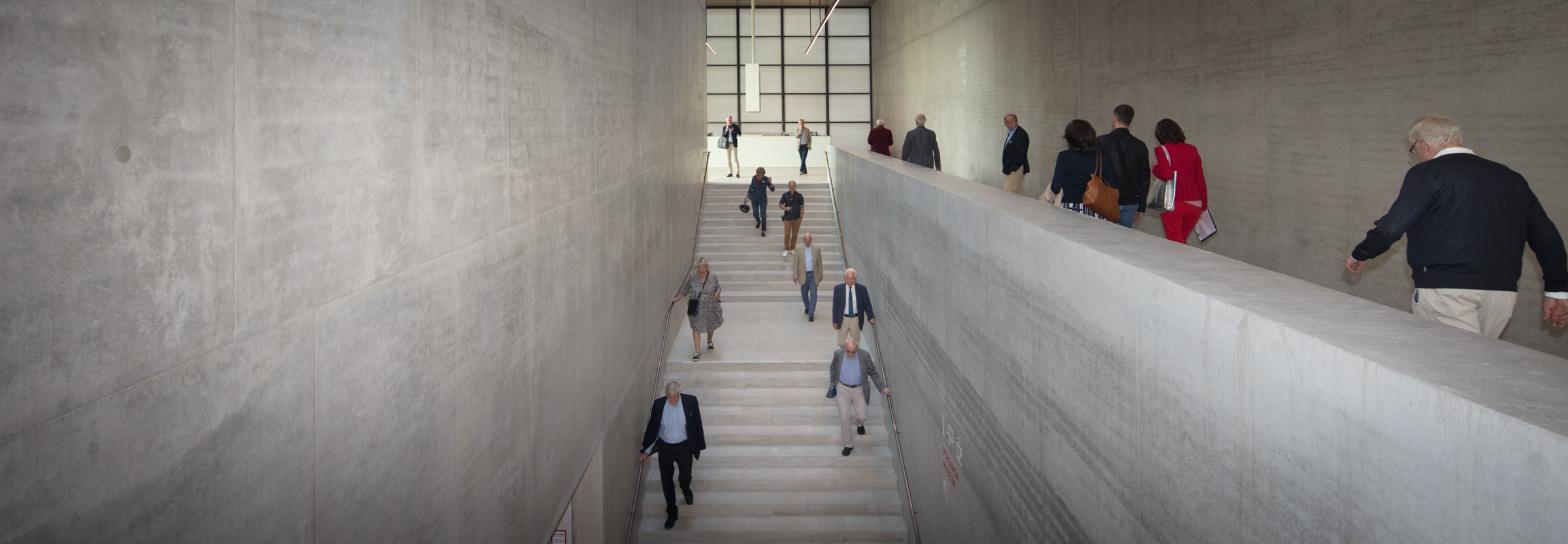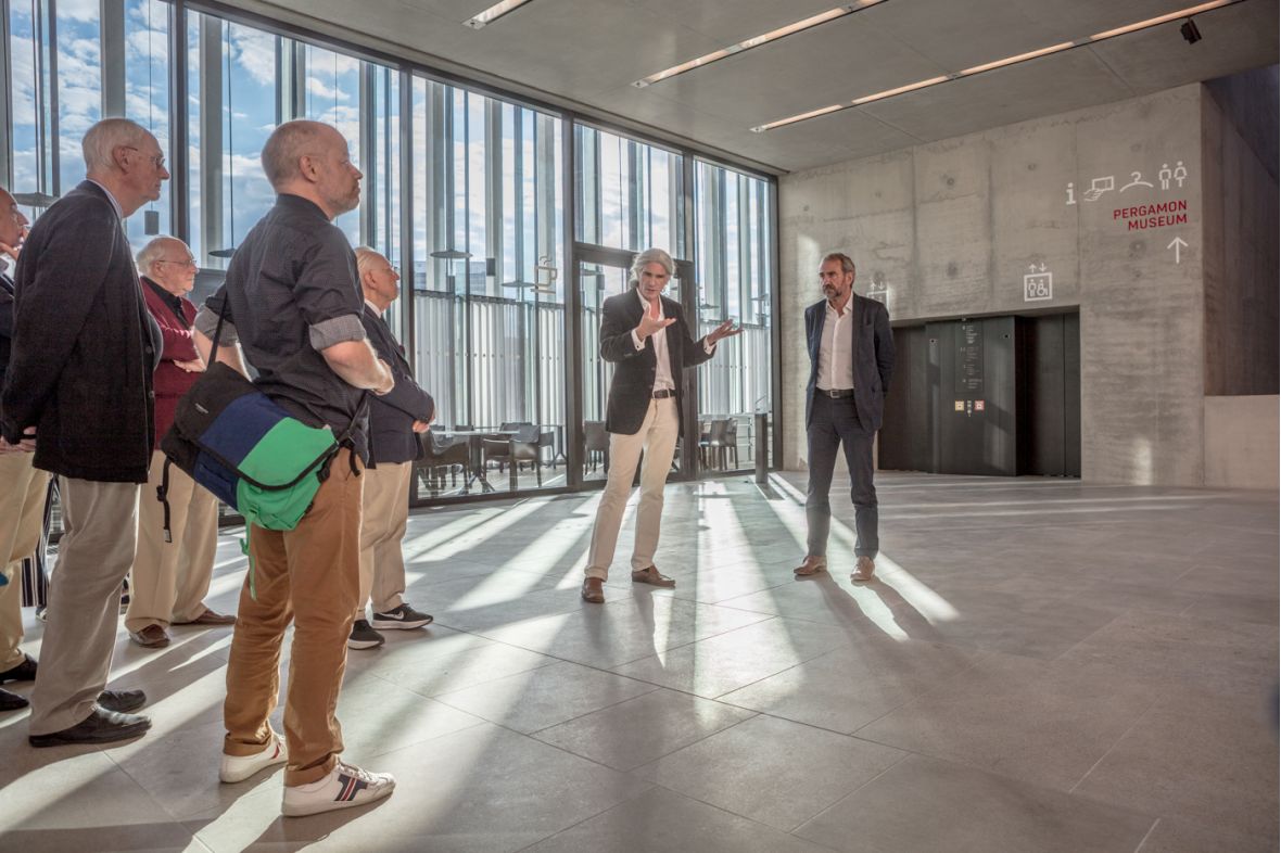 Eine Woche vor der offiziellen Eröffnung konnten die Mitglieder des Berliner Presse Club das neue Eingangsgebäude auf der Museumsinsel besichtigen. Die Führung wurde von Prof. Parzinger höchstpersönlich geleitet, an seiner Seite Alexander Schwartz, der zuständige Partner beim Architekturbüro David Chipperfield. So gab es kundige Einblicke in den Neubau, der künftig im Rahmen des Masterplans Museumsinsel viele unterschiedliche Funktionen erfüllen soll. Die fünf Museen bekommen einen zentralen Eingangsort, von dem unterirdische Gänge, die Archäologische Promenade, zu den historischen Gebäuden führen. Namenspatron ist der Berliner Unternehmer James Simon, einer der bedeutendsten Mäzene in der Geschichte der Staatlichen Museen zu Berlin, der im 19. Jahrhundert große Teile seiner Sammlungen, u.a. die Büste der Nofretete, gestiftet hat. Die Architektur erschließt sich beim Sparziergang durch die Räume, deren Zuschnitt durch das schmale Grundstück am krummen Kupfergraben geprägt ist. Neben der großzügigen Eingangshalle mit den Ticket-Countern für Einzelbesucher sowie für organisierte Gruppen finden sich ein Auditorium mit 300 Plätzen, eine Sonderausstellungsfläche von 600 Quadratmetern, ein Café mit langgestreckter Sonnenterrasse und Westblick sowie ein in Walnussholz hochwertig gestalteter Museums-Shop. Auch die Innenarchitektur stammt von David Chipperfield. Der Rundgang in den noch vollkommen leeren, jungfräulichen Räumen hatte seinen ganz eigenen Charme. Prof. Parzinger und Architekt Schwartz erläuterten die Schwierigkeiten beim Bau, die im Berliner Untergrund lagen: Bauen auf Wasser und Sand. Für das notwendige Unterwasserbetonverfahren wurden, ähnlich wie bei der Staatsoper wenige Meter weiter, zunächst die alten Eichenpfähle "gezogen" und durch Betonpfähle ersetzt, die in einer Tiefe von mehr als 30 Metern festen Grund erreichen. Beim Beschluss zu diesem Bau im Jahr 2006 wurde nach ersten Entwürfen mit einer Summe von 71 Millionen Euro kalkuliert. Die Endsumme heute liegt bei rund 131 Millionen Euro. Mit der James-Simon-Galerie ist die Neubauphase auf der Museumsinsel beendet. Doch Baustellen wird es weiter geben. Die Restaurationsarbeiten am Pergamonmuseum gehen weiter und als nächstes wird auch die Modernisierung des Alten Museums in Angriff genommen. Mit der kompletten Erfüllung des Masterplans Museumsinsel rechnet der Präsident der Stiftung Preußischer Kulturbesitz frühestens in 15 Jahren. Juliane Hielscher